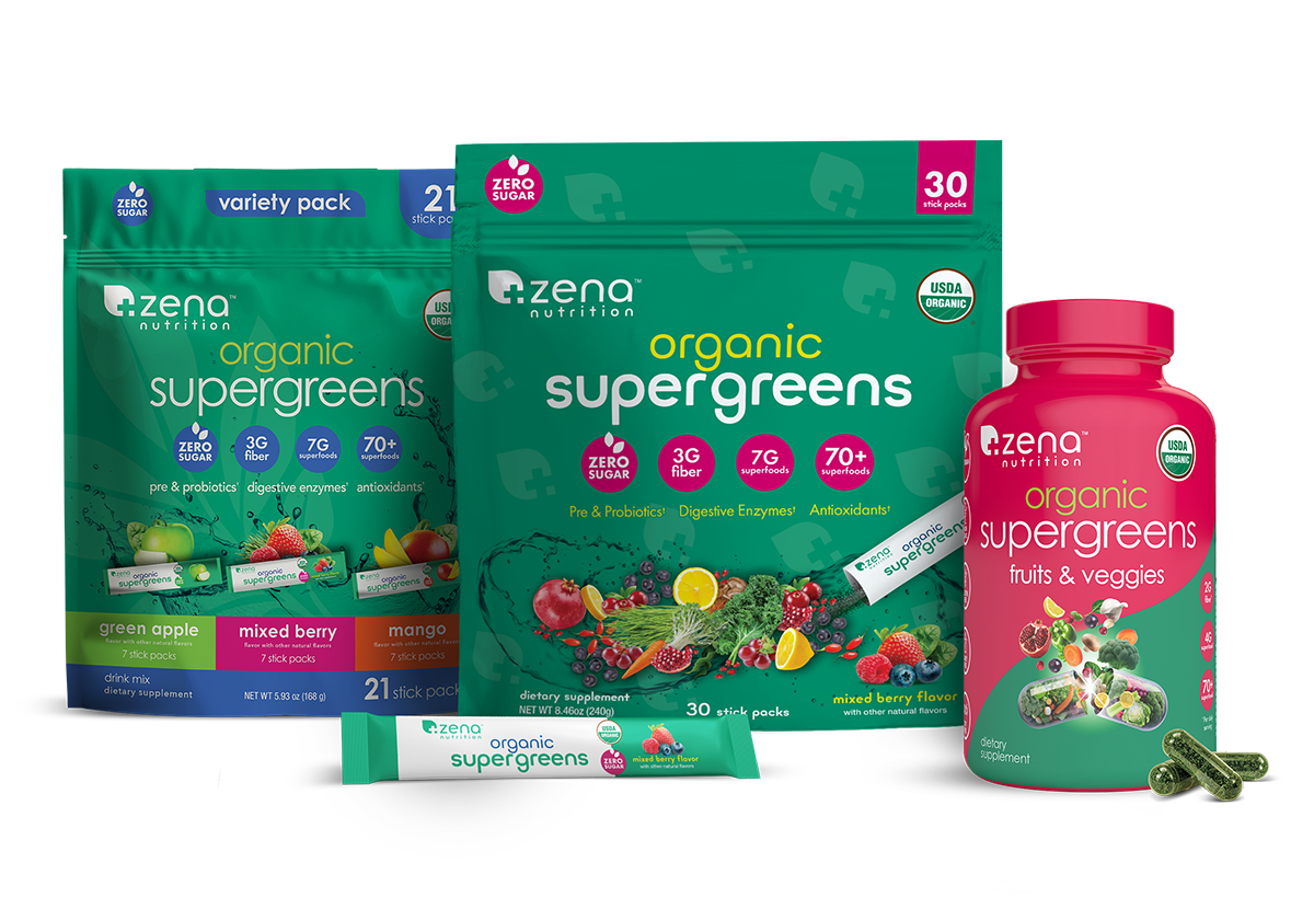Zena Organic Supergreens is USDA organic certified and offers a unique blend of fruits, vegetables, superfoods, digestive enzymes, and probiotics.