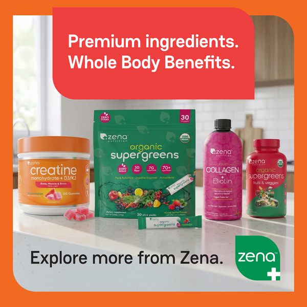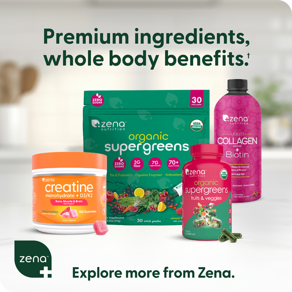 Zena Organic Supergreens is USDA organic certified and offers a unique blend of fruits, vegetables, superfoods, digestive enzymes, and probiotics.