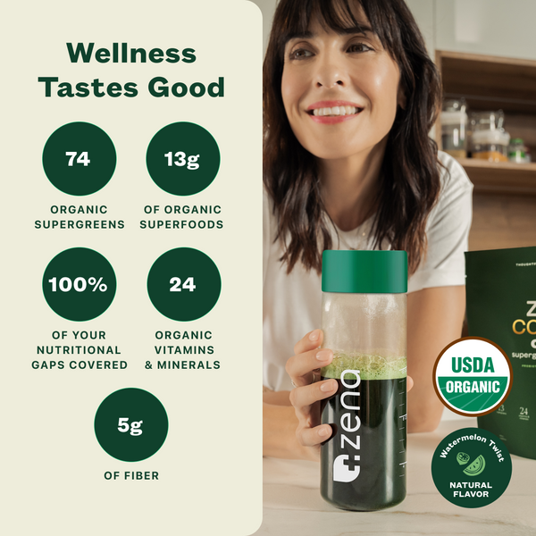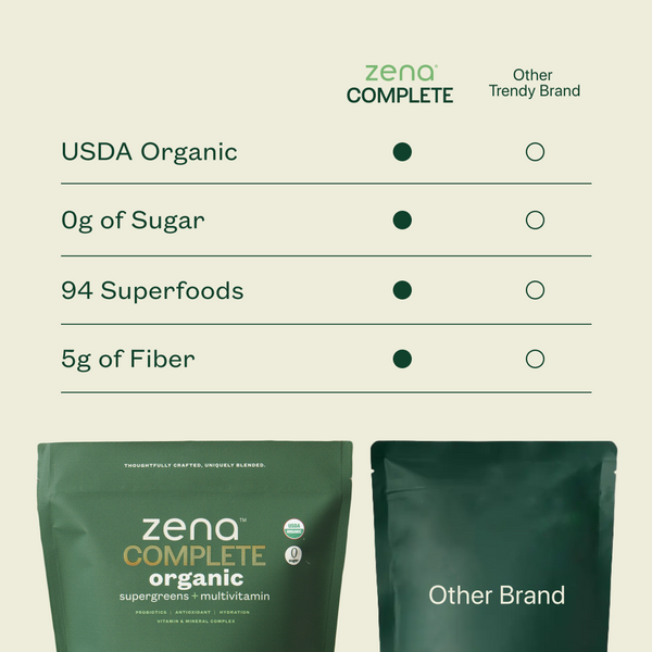 Our Supergreens are unmatched. With certified organic ingredients and over 70 nutrient-rich superfoods, Zena does things differently. Our products are made in cGMP-certified facilities and every batch is rigorously tested by an independent third party to ensure safety, purity, and quality you can trust.